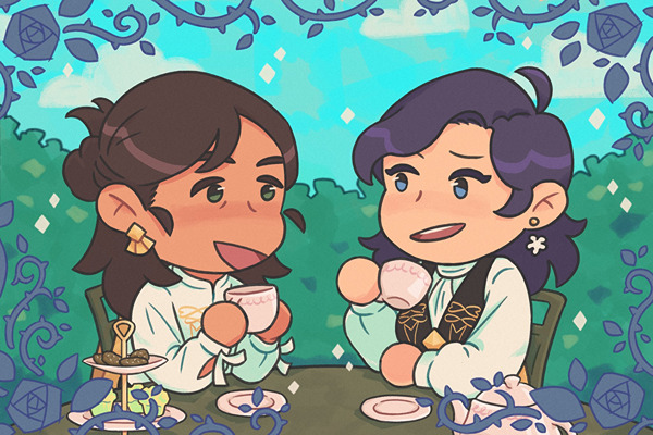 my friend enye and i have very close birthdays β only a calendar day apart. we celebrate it different ways each year, but in 2022 she drew our fodlansonas (AKA our fe3h self-inserts) together!!! perfect tea time...